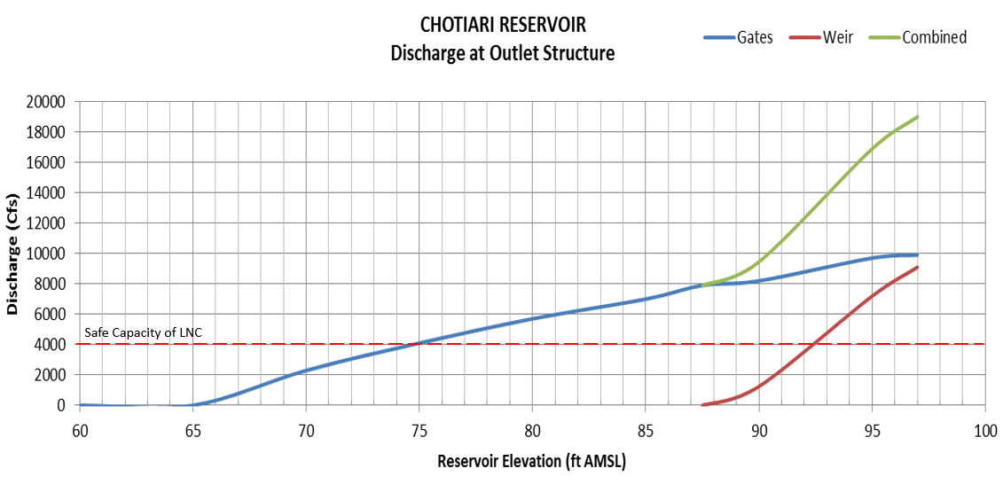 • In case the LNC is running at its normal designed discharge of 2600 Cfs, it can safely pass only about 1400 Cfs.