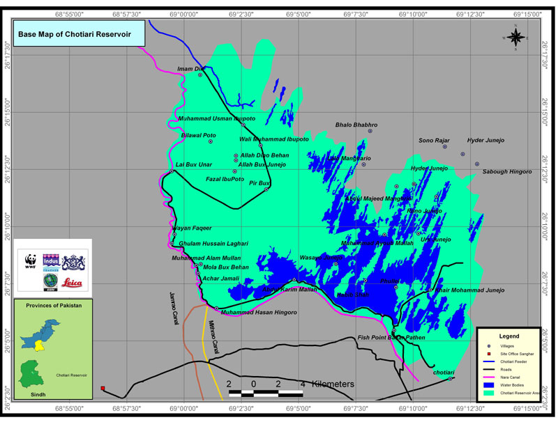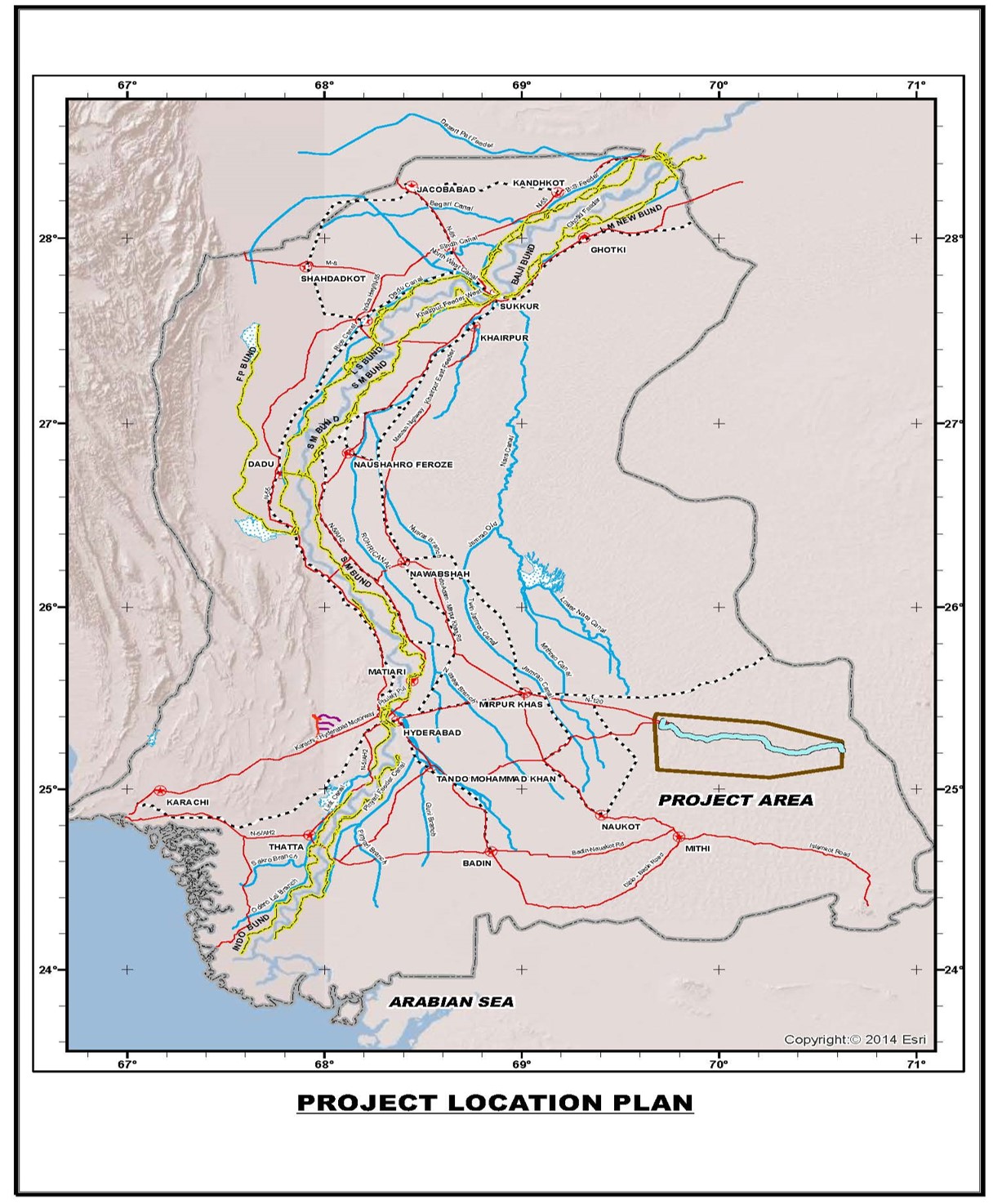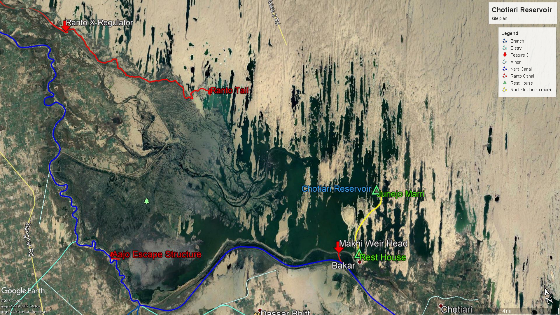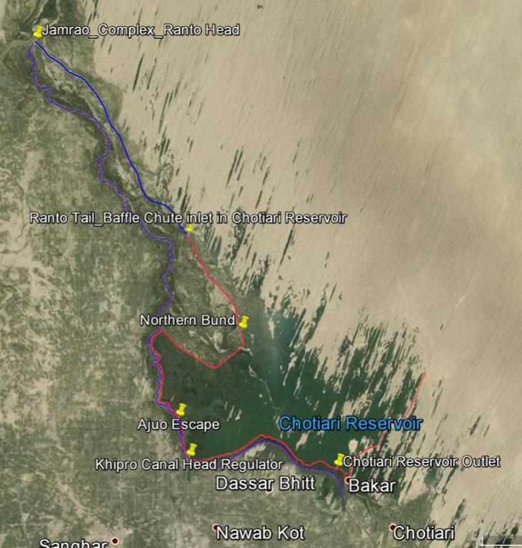 INTRODUCTION : The Chotiari Reservoir is a strategically located off-canal storage reservoir situated approximately 20 miles east of Sanghar, within the graticule of N260 5' - 260 16' E 690-0 to 690 11'. It comprises several natural depressions or lakes, primarily Makhi and Baqar, enclosed by the Larkana-Naushehro Feroze Canal (LNC) and Thar Desert sand dunes. The reservoir's construction was commissioned in 2003 to increase the storage capacity of these lakes and enhance irrigation supplies to the Lower Nara Canal (LNC) command area. This introduction provides an overview of the geographical location and purpose of the Chotiari Reservoir.