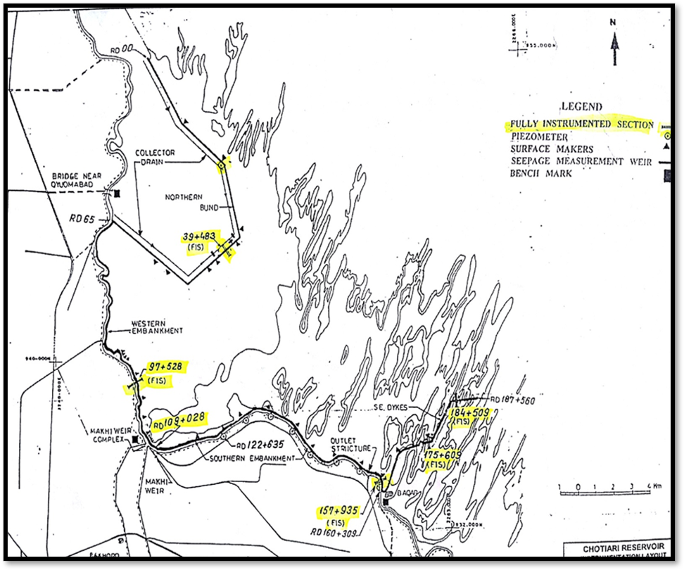 • All the instruments used are simplest ones, locally manufactured.Instruments were installed in Chotiari Reservoir Embankments after the construction of the embankments which commenced in September 1994 and was completed in December 2002.In all 05 Fully Instrumented piezometer Section (FIS) are chosen, covering the Northern Bund, The Western Embankment, the Southern Embankment and the South-Eastern Dykes.