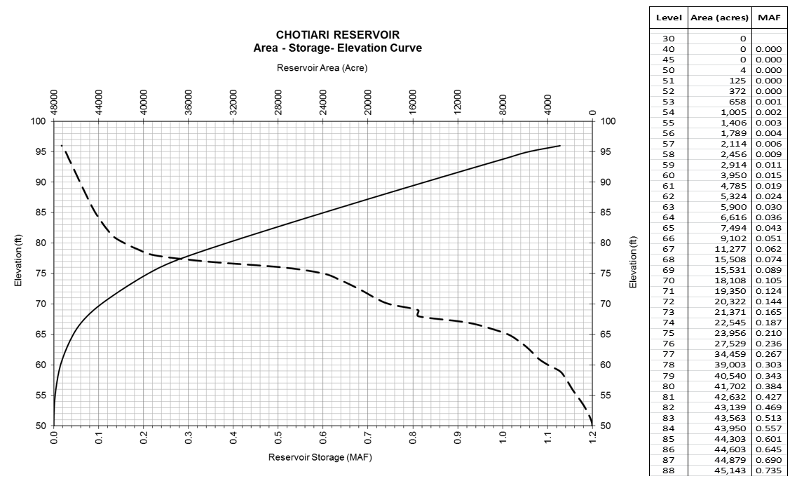Role : The reservoir plays a vital role in the water management system by receiving water from the Ranto Canal and the Aujo Escape, which are off-takes from the Jamrao Head and Makhi Complex respectively. With a significant embankment stretching 35.5 miles, the Chotiari Reservoir has one of the world's longest reservoir embankments. It stores 0.71 million acre-feet (MAF) of water, covering an area of 78 square miles at the Normal Pool Level of 87.5 feet. The Live Storage of the reservoir is 0.62 MAF. The LBOD-1 project further increased the storage capacity to 0.71 MAF to benefit the Jamrao System indirectly by feeding the Lower Nara Canal through the enhanced storage of the Chotiari Reservoir, as a direct transfer to the Jamrao system was not feasible.