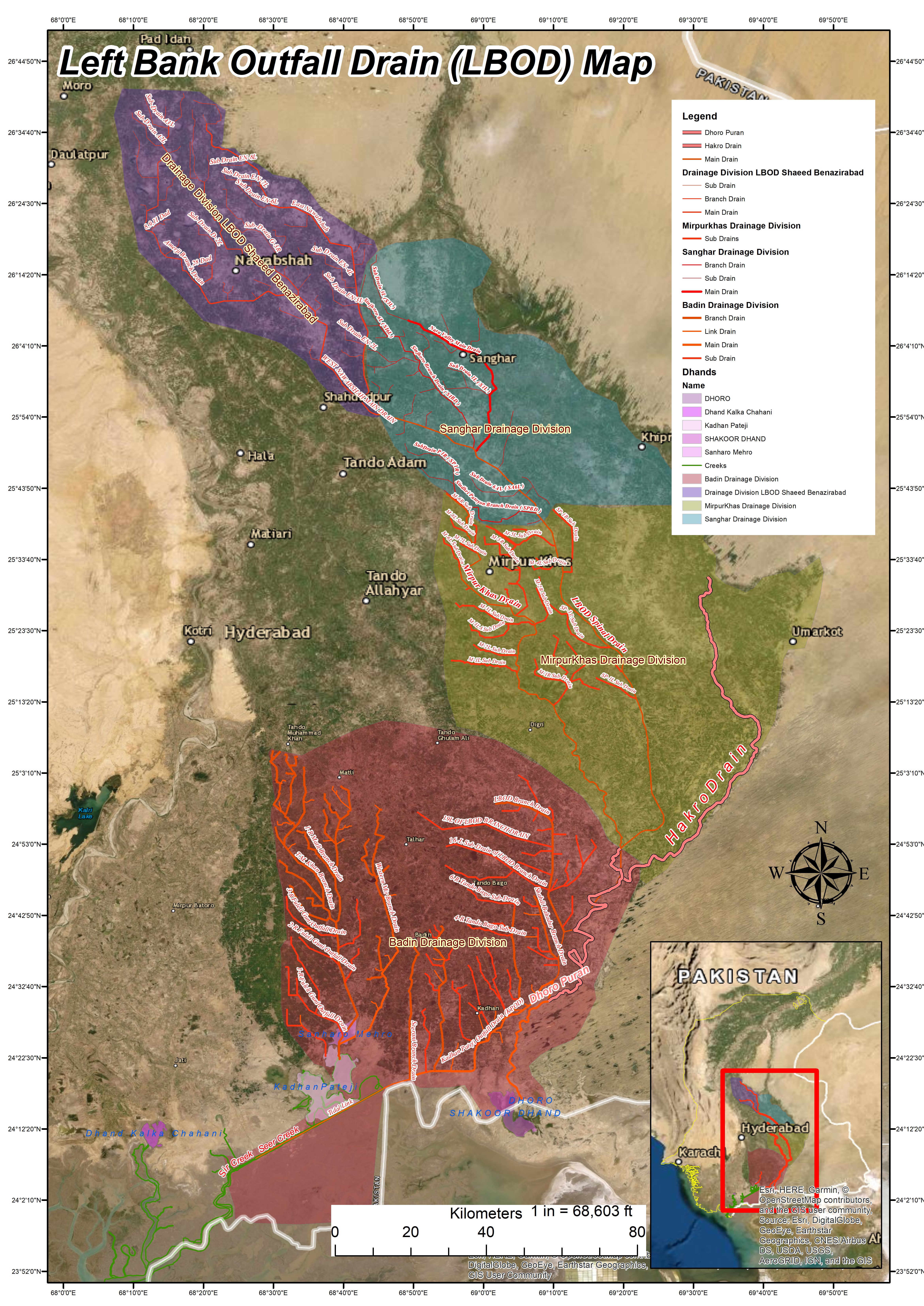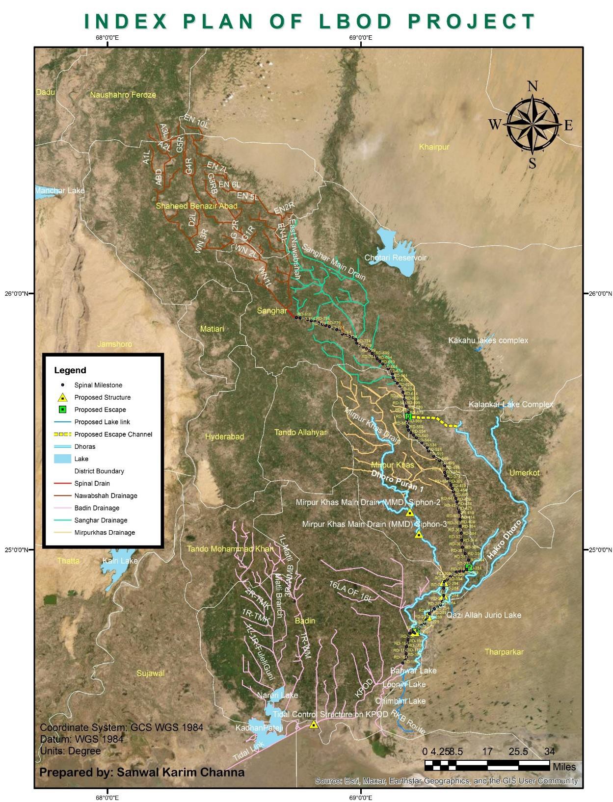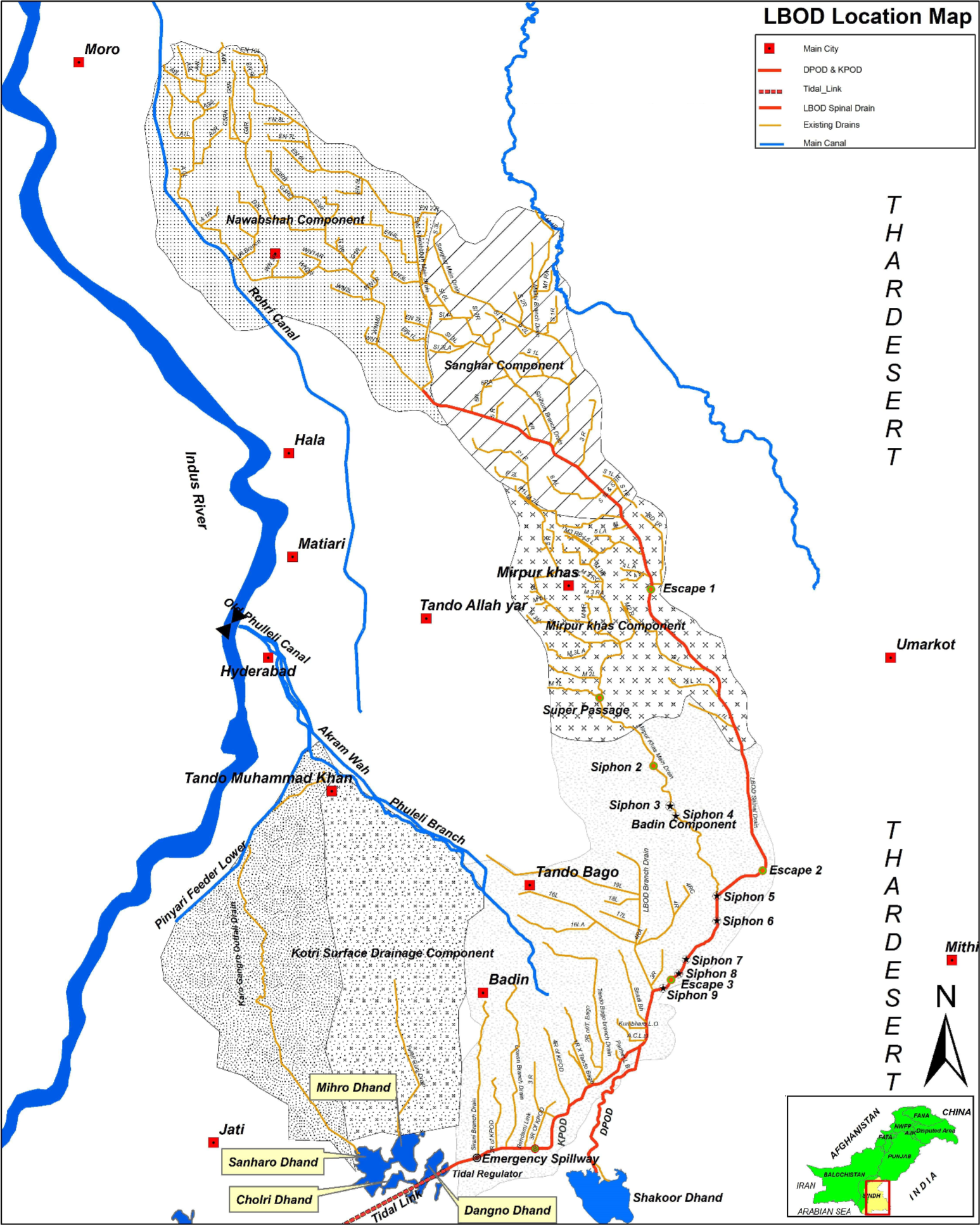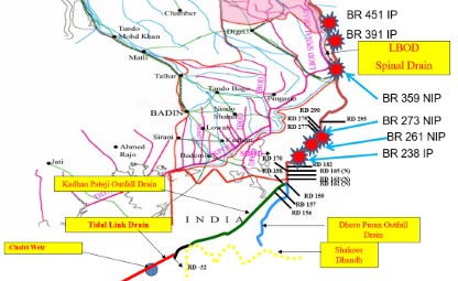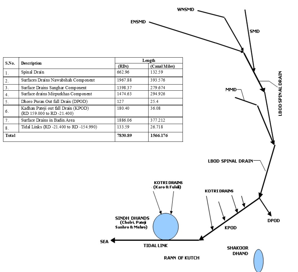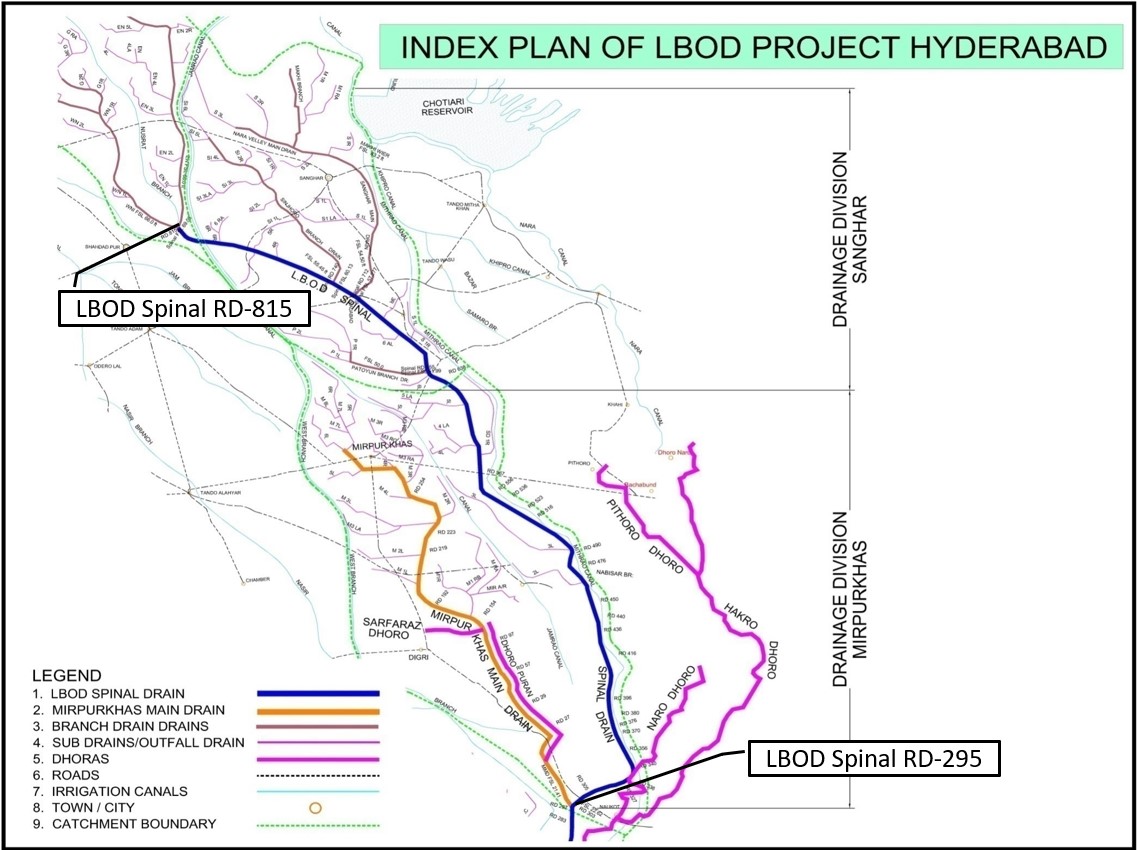 Background : The Left Bank Outfall Drain (LBOD) Project, approved by the International Development Association (IDA) on December 13, 1984, received a credit of $150 million. LBOD Stage I, implemented between 1984 and 1997, aimed to address waterlogging and salinity issues in 1.27 million acres across Shaheed Benazirabad, Mirpurkhas, Sanghar, and Badin Districts. The project's key component is the Spinal drain, which connects the drainage network to the sea through a Tidal Link. The LBOD spinal drain collects excess drainage and distributes it through a weir to two branch drains, the Kadhan Pateji Outfall Drain (KPOD) and the Dhoro Puran Outfall Drain (DPOD). The system was designed to direct highly saline drainage into the KPOD and ultimately to the sea via the 26-mile long canal known as the Tidal Link.