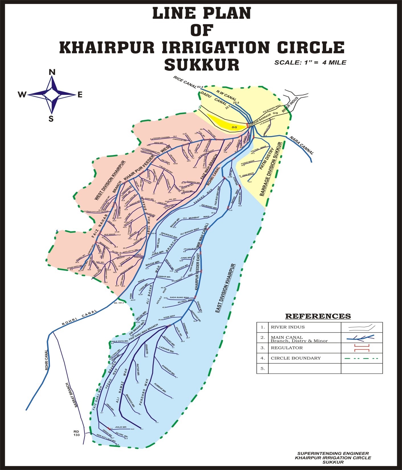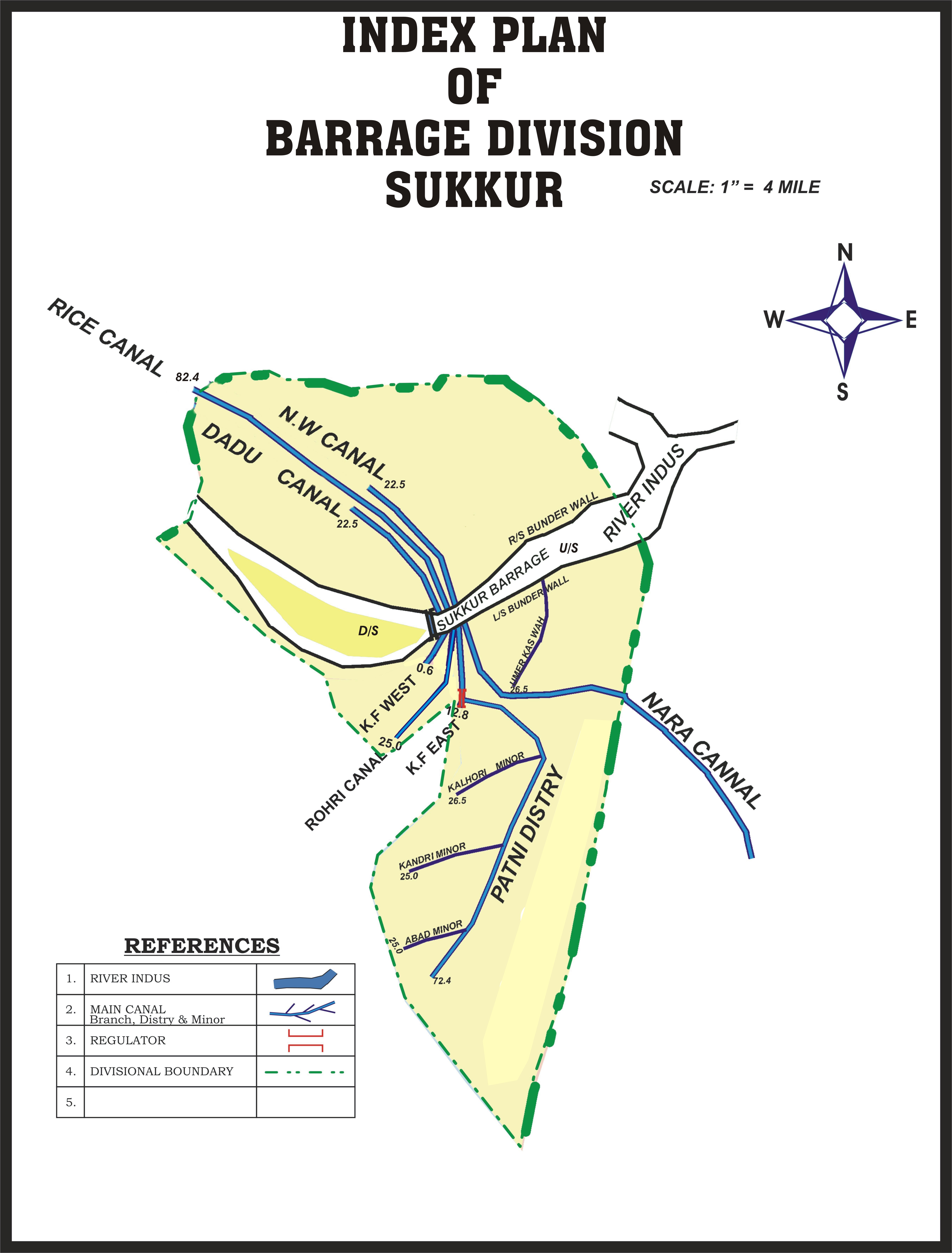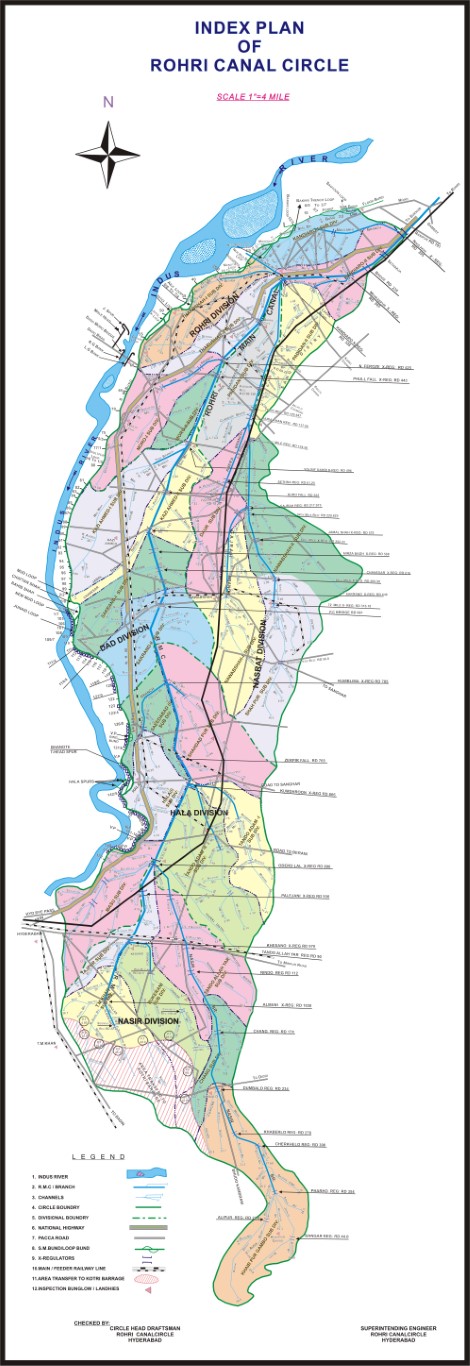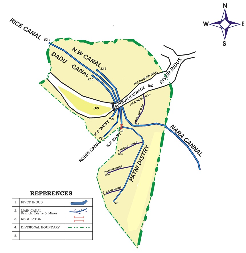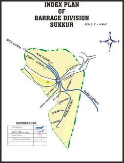 This Barrage which is the backbone of the economy of the entire Country through its net-work of Canals providing Irrigation supplies or an area of 7.63 million acres which forms approximately 25% of total canal irrigated area of the country. The Nara canal which is one of the 7 Canals off taking from this Barrage is the longest canal of this country, carrying discharge almost equal to that of Thames River at London and its bed width which is 346 ft. is 1 ½ (one and half) times as big as of Suez Canal. In fact Nara Canal is not a man-made canal has it was the southern-most part of Hakro River which emanated from the foot hills of Sutlej which after traversing through the Punjab and Bhawalpur Plains joined Nara through Raini River, the remnants of which are still exiting in Ghotki Taluka.