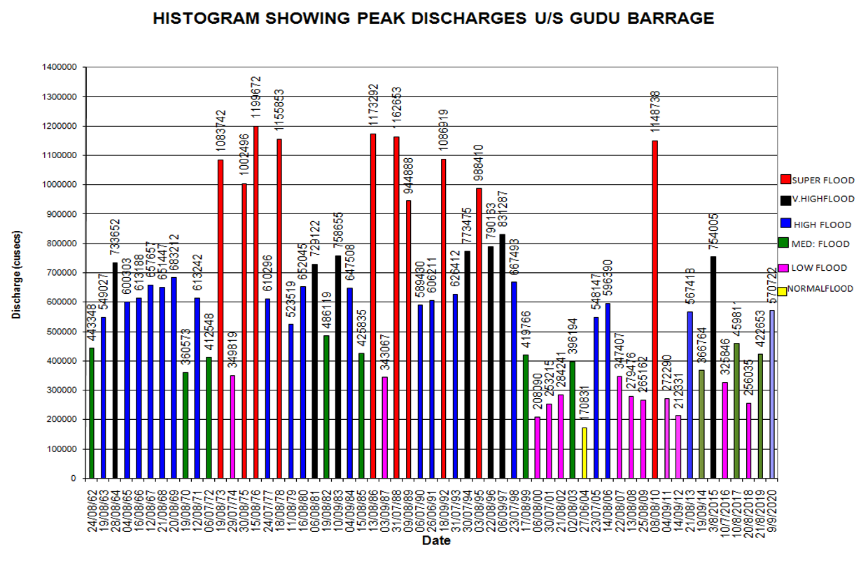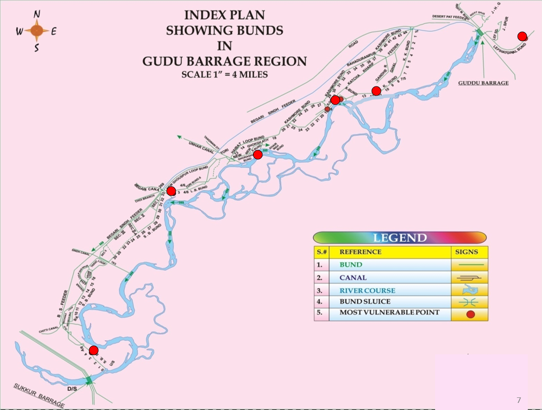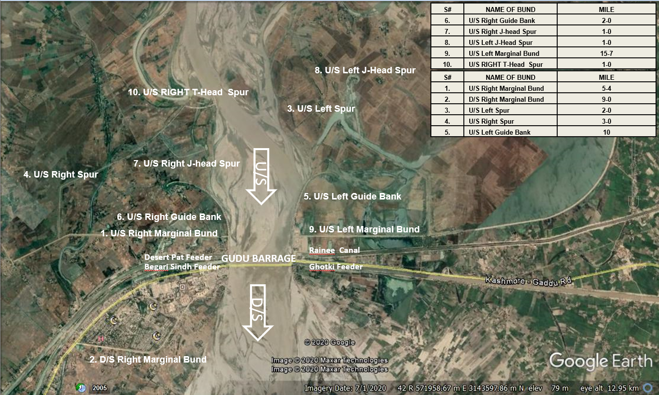 The Barrage is situated 10 miles north-west of Kashmore and about 100 miles upstream of Sukkur Barrage on River Indus, almost at the northern boundary of Sindh Province. The Barrage has been designed for providing assured water supply and improvement and extension of Irrigation facilities of Sindh and Baluchistan areas, which were being irrigated by inundation canals, the supplies of which were depending on uncertain fluctuating water levels of River Indus. The construction of head works was completed in the year 1962. The whole area commanded by the Guddu Barrage designed non-perennial.
